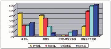 圖1 所示從1999年到2002年(2002年的數(shù)據(jù)是由上半年數(shù)據(jù)推算而來)單探頭、雙探頭、雙探頭帶定位系統(tǒng)和多探頭符合線路,四種不同核醫(yī)學(xué)設(shè)備每年各種類型所占比例?梢钥闯觥W顬槊黠@的是普通雙探頭在2002年僅僅占總數(shù)的5%,普通單探頭占總數(shù)25%,多探頭帶符合電路系統(tǒng)占總數(shù)59%。普通雙探頭帶X線定位系統(tǒng)占總數(shù)10%。可以看出單探頭SPECT和多探頭符合電路系統(tǒng)呈增長趨勢,尤其以多探頭符合電路系統(tǒng)更為明顯。