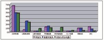 圖2 從2001年7月-2002年6月調(diào)研10家單探頭用戶、5家普通雙探頭用戶和30家雙探頭可變角度帶有符合電路用戶臨床檢查類型的數(shù)據(jù)。為了便于比較,采用相對數(shù)的方法?梢钥闯鰧τ趩翁筋^用戶在臨床主要用于骨掃描和甲狀腺檢查。對于雙探頭帶有符合電路系統(tǒng)的用戶,骨掃描46%、心肌血流灌注23%、符合電路10%、甲狀腺9%、心肌代謝7%、GA-67為2%,其它(腎臟、肝等)3%。可以看出雙探頭符合電路系統(tǒng)最大的貢獻是為臨床開拓出20%新的檢查項目,最為重要的是這些檢查項目將成為主流臨床檢查。這可能是雙探頭(多探頭)符合電路在國內(nèi)急劇增加的主要原因。