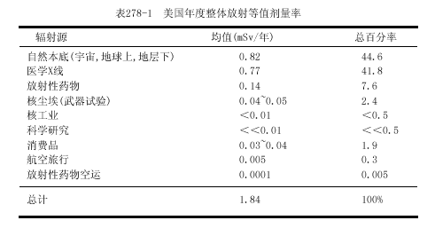 常用的測量單位是倫琴,戈瑞(Gy)和希沃特(Sv).倫琴(R)是空氣中x或γ電離輻射的計量單位,戈瑞是被各組織或物質(zhì)吸收的能量計量單位,它可應用于各類輻射.R和厘戈瑞(cGy)基本上是相等的.在說明生物學效應時,Sv與經(jīng)質(zhì)量因子校正的Gy相等.因為對一定量的能量而言,不同類型的輻射可產(chǎn)生不同的生物學效應;例如,中子有較大的效應.對X和γ輻射,Sv與Gy相等.在現(xiàn)代術(shù)語中Gy和Sv已替代拉德(rad)和雷姆(rem),Gy=100rad,Sv=100rem.在非專業(yè)刊物中常常將輻射分為低水平輻射(0.2~0.3Gy)和高水平輻射(>0.3Gy).而醫(yī)學劑量一般為<0.05Gy,而且常常<0.01Gy.地球及其大氣的本底放射活性水平很低,而不能測知其效應(表278-1).